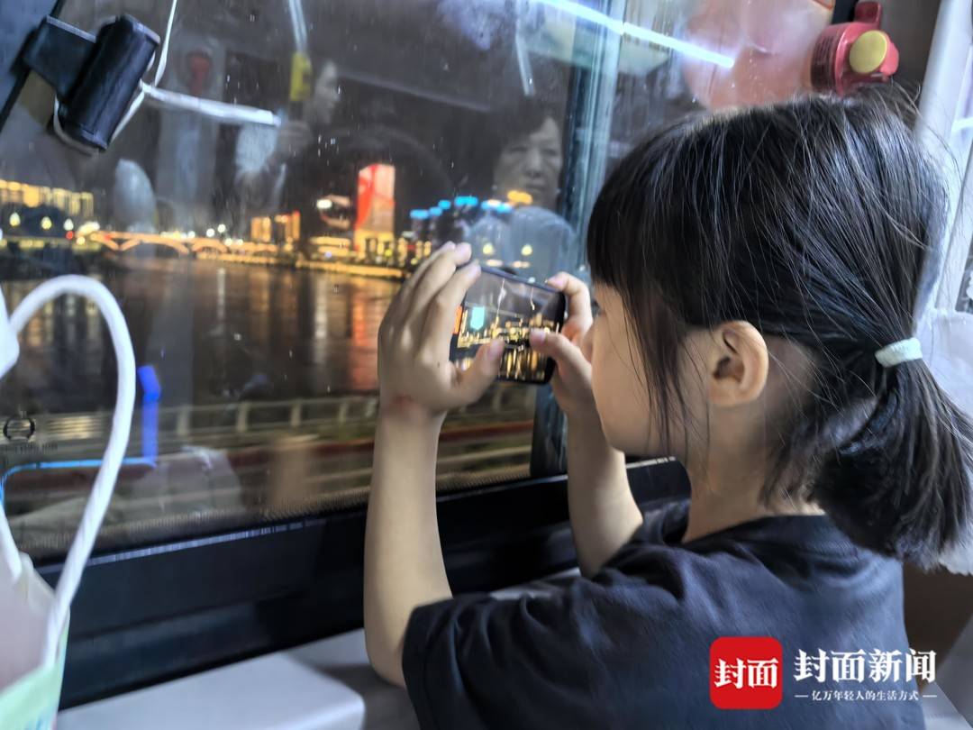 游客在“宜宾好巴士”双层观光车上欣赏三江口夜景。